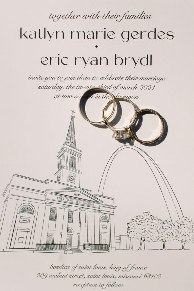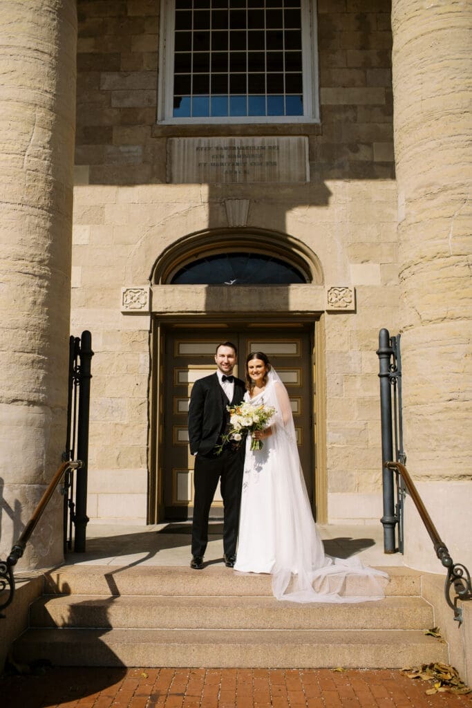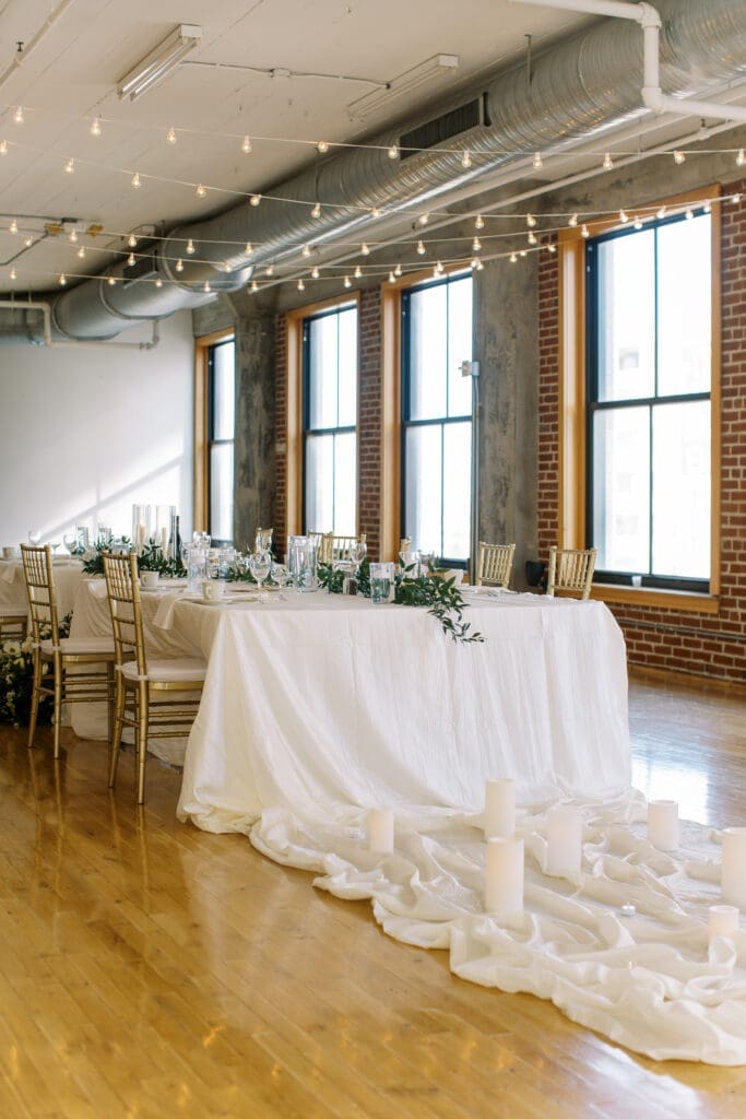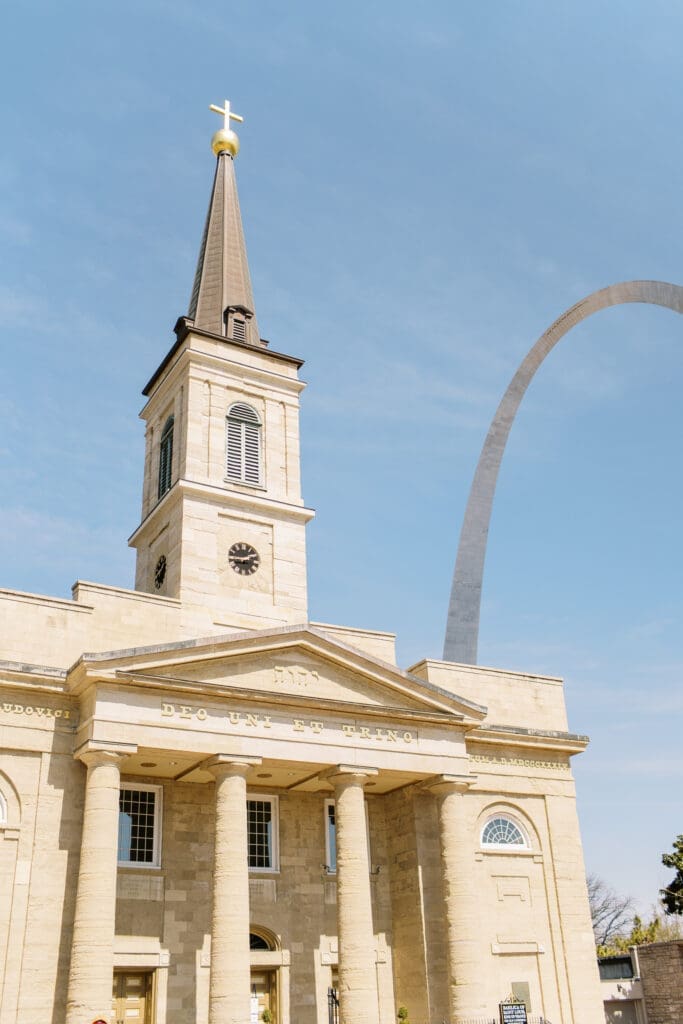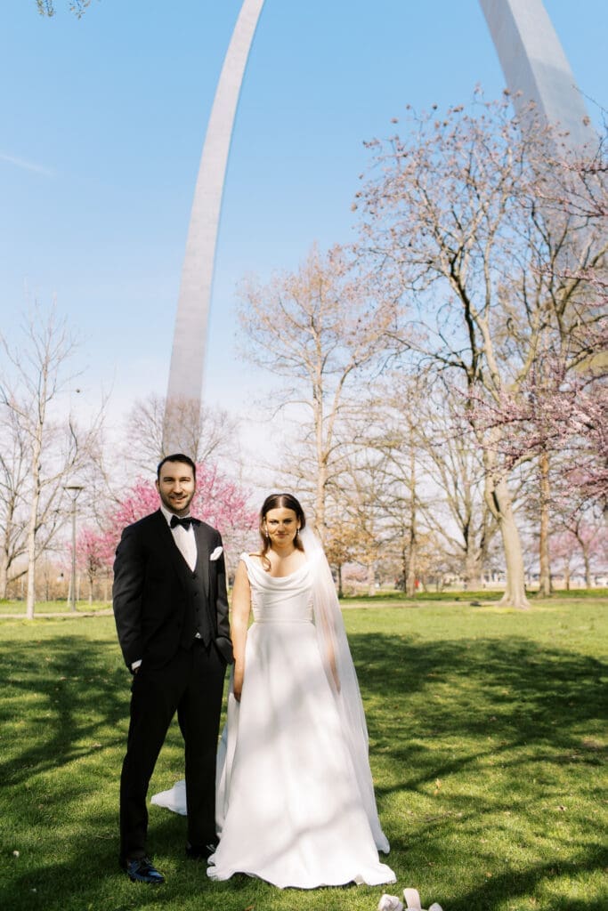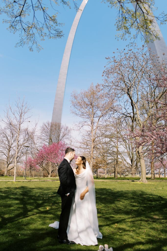 Katlyn & Eric had a beautiful spring day for their nuptials. Choosing St Louis for their celebration, the couple rented a quaint airbnb for morning prep & their first look, followed by a Catholic ceremony at the gorgeous Old Cathedral . Beautiful architecture inside and out, and the Couple chose to do family photos on the stairs between the massive columns on the exterior. A short walk to the St Louis Arch, we took the paved walkways lined with pink blooming trees, and captured relaxed photos of the Newlyweds. From there the Couple head to the historic loft, Windows On Washington St Louis. The loft space overlooks the street below and has amazing city views, from its ample windows and balcony. The room was dressed in ivory linens and tall centerpieces filled with lush greenery. Simple floral stems and candlelight dressed guest’s tables.