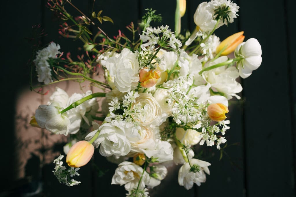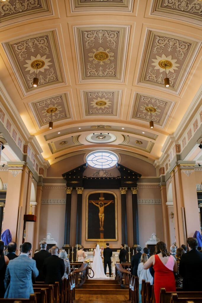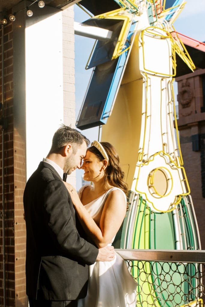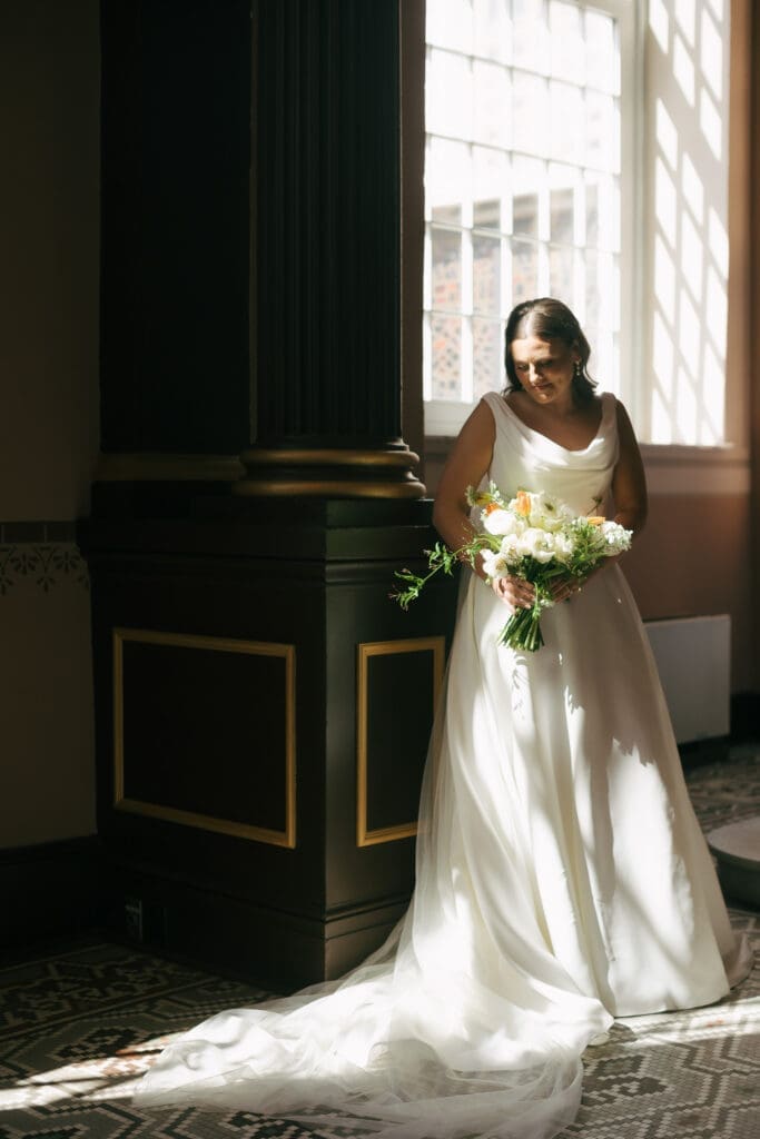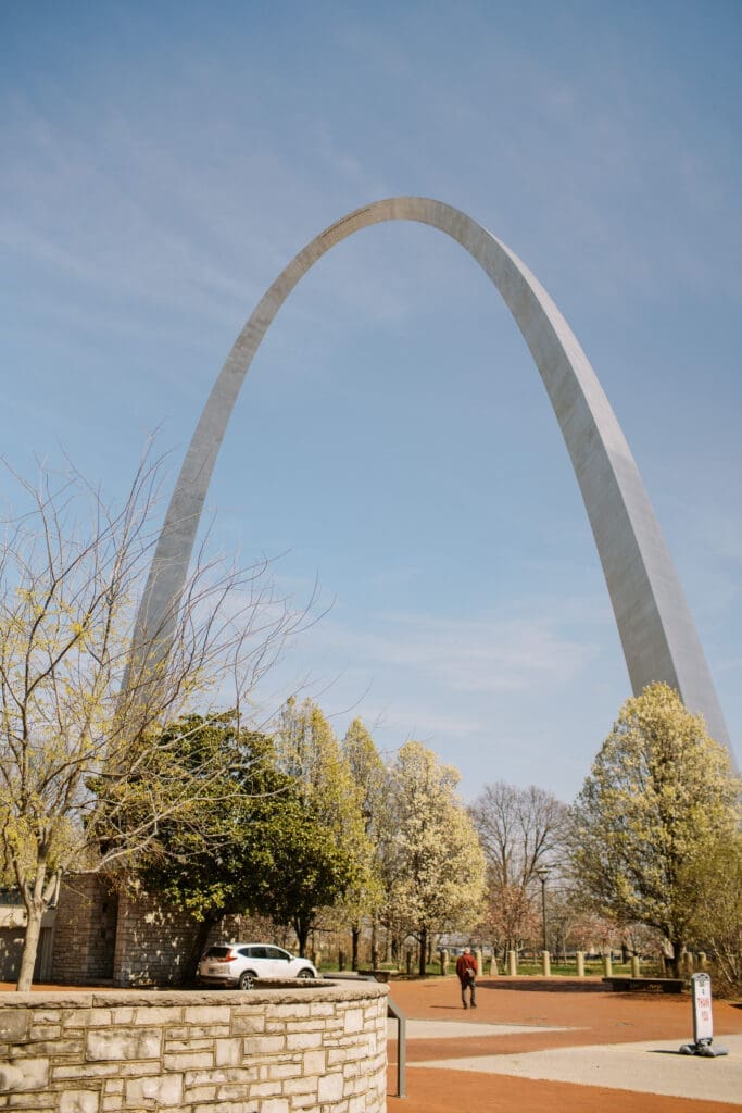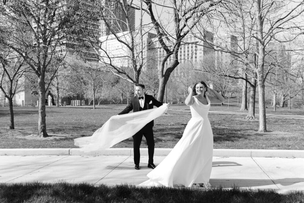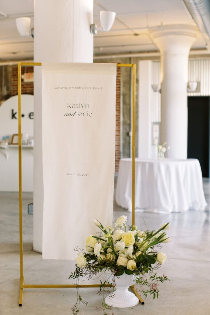 Katlyn & Eric had a beautiful spring day for their nuptials. Choosing St Louis for their celebration, the couple rented a quaint airbnb for morning prep & their first look, followed by a Catholic ceremony at the gorgeous Old Cathedral . Beautiful architecture inside and out, and the Couple chose to do family photos on the stairs between the massive columns on the exterior. A short walk to the St Louis Arch, we took the paved walkways lined with pink blooming trees, and captured relaxed photos of the Newlyweds. From there the Couple head to the historic loft, Windows On Washington St Louis. The loft space overlooks the street below and has amazing city views, from its ample windows and balcony. The room was dressed in ivory linens and tall centerpieces filled with lush greenery. Simple floral stems and candlelight dressed guest’s tables.